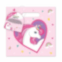 4 st. kalaspåsar i enhörningstema i lite kraftigare material som därför kan användas flera gånger. Påsarna är ca 20 × 20 cm stora.