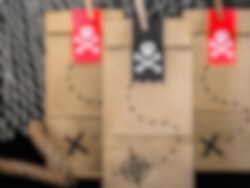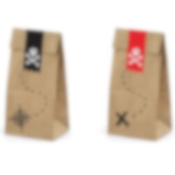 6 st kalaspåsar i papper med piratmotiv på. Det medföljer även självhäftande röda och svarta klistermärken som kan användas som förslutare av påsarna. Fyll kalaspåsarna med godsaker och skicka ut alla barnen på skattjakt. Kalaspåsarna är ca 8 x 18 x 6 cm stora.