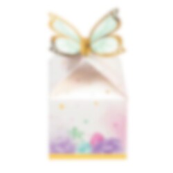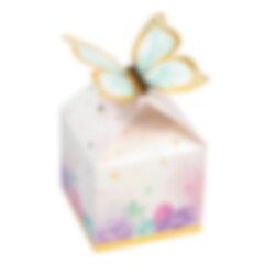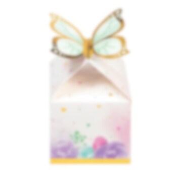 8 st. exklusiva partyboxar i fina färger och med en pastellfärgad fjäril med guldfoliedetaljer på toppen. Perfekta att lägga godis och överraskningar i till kalaset. Partyboxarna har en storlek på 12 x 10 cm. Tillverkade av papper.