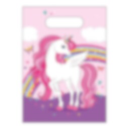 6 st. kalaspåsar av plast med vackert enhörningsmotiv i pastellfärger. Fyll påsarna med godis, små leksaker eller roliga överraskningar som barnen kan ta med sig hem efter kalaset.