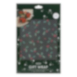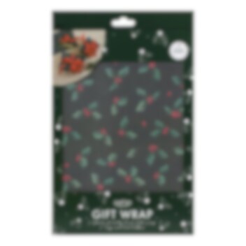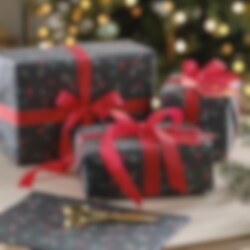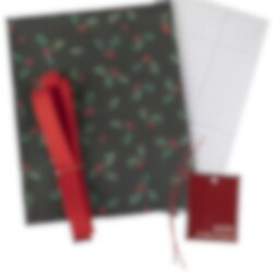 Slå in dina presenter och julklappar med detta fina presentpapper med motiv av järnek och ett lyxigt rött presentband samt tillhörande Merry Christmas-etiketter.