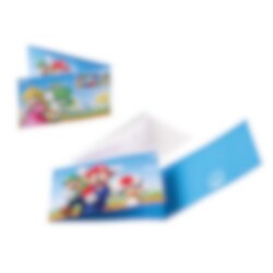 8 st. coola inbjudningskort med tillhörande röda kuvert med motiv av bröderna Mario och Luigi samt Toad från spelserien Super Mario. Bjud in dina kompisar på ett roligt och oförglömligt kalas med hjälp av dessa. All text är på engelska.