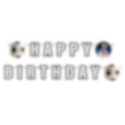 Girlang av papp i fina färger med fotbollstema och texten "Happy Birthday". Girlangen är 180 cm lång och bokstäverna är ca 13,5 cm höga.