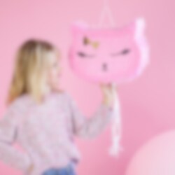Pinata som föreställer en rosa katt. Fyll pinatan med godis och leksaker och låt sedan barnen dra i snörena för att se vem det är som tömmer innehållet. En rolig grej att avsluta kalaset med. Pinatan är ca 35 x 27 x 9 cm stor och säljs tom.