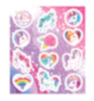 12 st. klistermärken med söta enhörningsmotiv. Roliga att lägga i kalaspåsen när det är kalasdags.