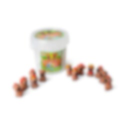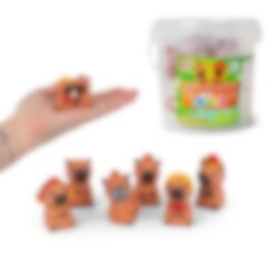 12 st. capybaras i olika färger och former, tillverkade som gulliga mini squishy-figurer. Varje figur är inplastad och levereras i en praktisk plasthink med lock.
