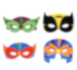 Roliga superhjältemasker av mjukt skummaterial i fyra olika utföranden. Med dessa kan du och vännerna klä ut er till superhjältar på ditt kalas. Maskerna är bekväma och håller sig på plats med hjälp av ett resårband. Maskerna säljs osorterade och styckvis.