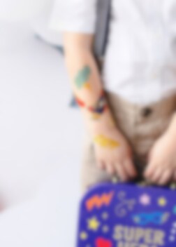 Ta bort den klara filmen från toppen av tatueringen och placera tatueringen mot huden. Blöt det vita papperet bakom tatueringen med vatten och vänta ca 30 sekunder. Ta försiktigt bort papperet så överförs bilden till huden. Försvinner om några dagar. Kan tas bort från huden med babyolja
