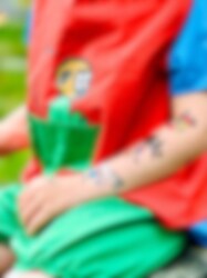 Ta bort den klara filmen från toppen av tatueringen och placera tatueringen mot huden. Blöt det vita papperet bakom tatueringen med vatten och vänta ca 30 sekunder. Ta försiktigt bort papperet så överförs bilden till huden. Försvinner om några dagar. Kan tas bort från huden med babyolja.