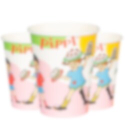 8 st. pappmuggar med färgsprakande motiv från Astrid Lindgrens Pippi Långstrump. Muggarna är ca 10 cm höga och rymmer ca 250 ml.
