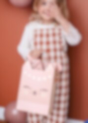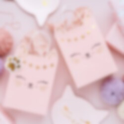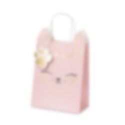 Presentpåse i rosa med gulddetaljer som sticker ut med sin vackra design av ett sött kattansikte. Påsen har två handtag, är tillverkad av papper och är 10 x 18 x 27,5 cm stor.