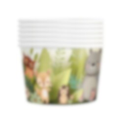 6 st. små glassbägare i vackra färger med söta motiv av olika skogsdjur. Bägarna är perfekta att servera glass, godis, snacks eller andra godsaker i. De rymmer 150 ml och har en storlek på 6 × 7 cm. Tillverkade av papp.