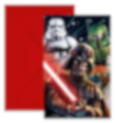 Bjud in till ett galaktiskt kalas med dessa coola Star Wars-inbjudningskort med motiv av Darth Vader, en Stormtrooper och Boba Fett. Perfekta för barn som älskar äventyr och vill samla vännerna till en riktigt spännande födelsedagsfest. I förpackningen ingår även sex röda kuvert.
