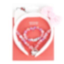 Ge outfiten en extra attityd med detta snygga smyckeset med Kuromi! Setet innehåller ett glittrigt diadem med kattöron, ett rosa och vitt pärlarmband med bokstäverna "LOVE", samt ett matchande halsband med en söt Kuromi-berlock. En perfekt accessoar för små fans av Hello Kitty-universumet som gillar att sticka ut!