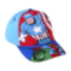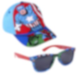Ett komplett kit med både en cool blå- och rödfärgad keps med superhjältarna från Avengers på och ett par premium solglasögon, båda i barnstorlek. På glasögonen finns motiv av Hulken, Captain America och Spiderman.