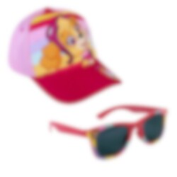 Ett komplett kit med både en söt rosa- och rödfärgad keps och ett par premium solglasögon, båda i barnstorlek. På glasögonen finns motiv av den söta hundvalpen Skye från Paw Patrol.