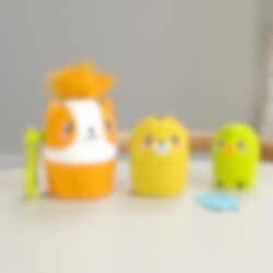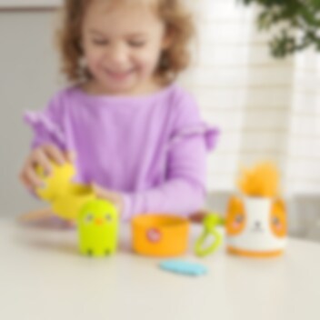Dessa djur är placerade från störst till minst, där de tre större djuren har olika typer av stängningar som uppmuntrar till kreativ lek och utveckling av fingerfärdighet. Hamstern fungerar dessutom som en kam för att borsta corgins päls. Tack vare den praktiska öglan kan barnen enkelt ta med sina husdjur överallt. Färger och dekorationer kan variera.