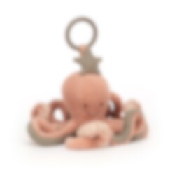 En kul aktivitetsleksak i form av en gammelrosa bläckfisk med åtta armar. De olika delarna av bläckfisken har prasslande, skallrande eller pipande ljud och strukturer att utforska, en bitring för de som behöver och många ringlande armar att leka med samt alltid ett glatt leende att erbjuda. Hängs upp med en ring i vagnen eller där du vill ha den. Tillverkad i polyester och handtvättas vid behov.