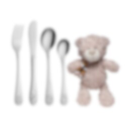 Ge bort en minnesvärd doppresent med detta vackra bestickset. Setet innehåller totalt 5 delar där besticken har graverade motiv av teddybjörnar. Utövar besticken så ingår ett mjukt och gulligt gosedjur.