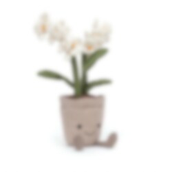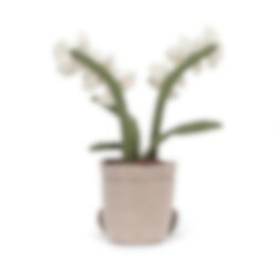 Denna gosiga och eleganta orkidé är alltid i blom och visar upp sina vackra, gräddvita blommor i velour med ståndare av smala orangea band. Orkidén har också blad av manchester och en kawaii-inspirerad leende kruka av linne med ett varmt leende och små ben. Denna muntra och eleganta krukväxt blir en både kul och snygg dekoration att liva upp fönsterbrädan eller skrivbordet med. Tillverkad av 100% polyester och handtvättas samt plan- eller hängtorkas vid behov.
