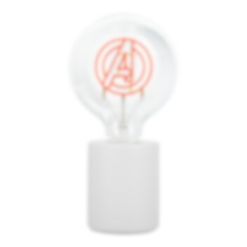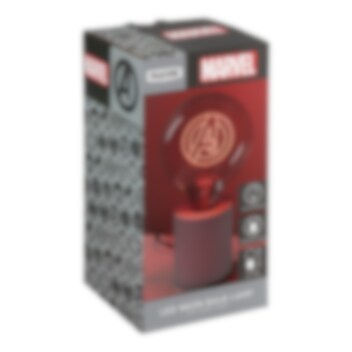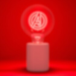Denna moderna bordslampa i trendig glödlampsdesign sprider ett mjukt rött LED-ljus som lyfter fram det ikoniska Avengers-emblemet – perfekt som stämningsfull belysning i sovrummet, på skrivbordet eller som dekorativ detalj i vardagsrummet.