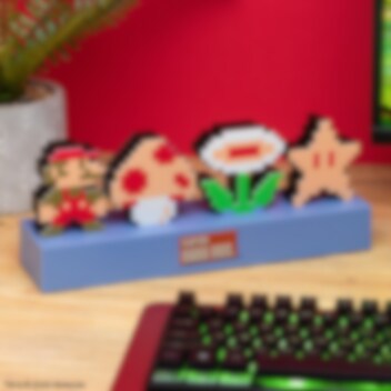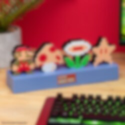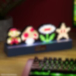 Riktigt häftig lampa som har motiv av Super Mario, Red Mushroom, Fire Flower och Super Star i klassisk retrostil från de tidiga Super Mario Bros spelen från Nintendo. Perfekt som dekoration i varje Super Mario fans hem.