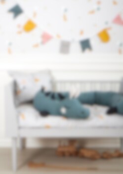 En cool och riktigt lång drake i sjögrön ekologisk bomull med broderade detaljer och fylld med OEKO-TEX certifierad polyester stoppning. Denna kudde kan fungera som stöd eller skydd för baby och småbarn, eller en kramgo kompis att slappa med för äldre barn.