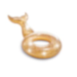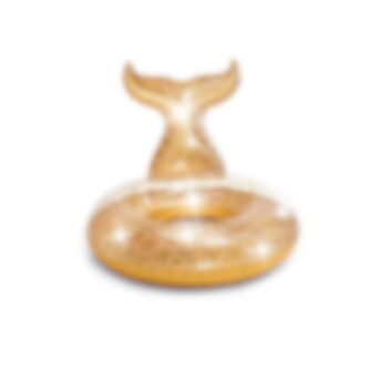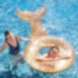 Riktigt exklusiv och lyxig sjöjungfru-badring i guld med massor av glitter. Du kommer att bli den allra häftigaste på stranden eller vid poolen med den här badringen. Den uppblåsbara glittersjöjungfrun är 147 x 107 x 79 cm.