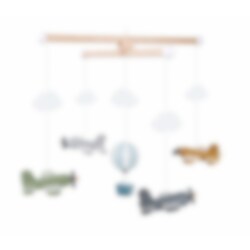 Mobil i trä från Jabadabado med tillhörande figurer i form av färgglada flygplan och en luftballong som hålls samman med ett snöre. En tjusig doppresent som föräldrarna kan hänga ovanför spjälsängen eller skötbordet som sedan stimulerar barnets sinnen och rörelser under de första månaderna. Mobilen är 36 x 36 x 36 cm stor.