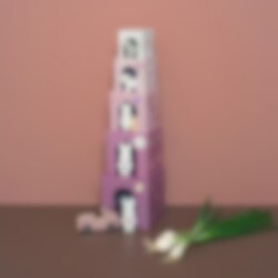 Ett set med 5 st. färgglada stapelbara kuber tillverkade i hård papp som är numrerade med siffrorna 1-5 och har två olika fina motiv på vardera sida. Det följer även med små träfigurer så som en bil, hund, katt, teddybjörn och kaniner.