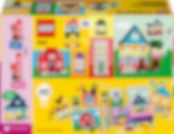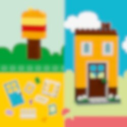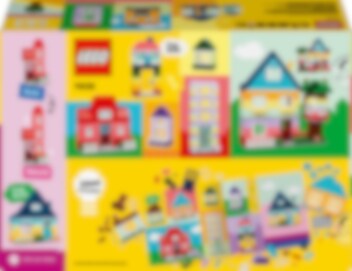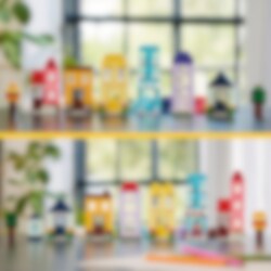 Bygg 6 färgglada hus med olika utformning, höjd och form. Det kreativa nöjet fortsätter när du lägger till klossar för att göra husen högre och byter dörrar, fönster, tak, trädgårdar och mer för att ändra husens design. Kolla in de 8 medföljande byggidéerna för ännu fler möjligheter och ännu häftigare byggnader. Eller kombinera massor av klossar för att bygga ett superstort hus!