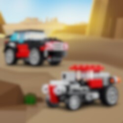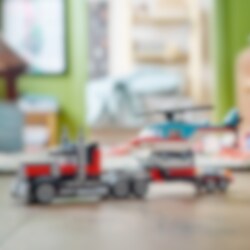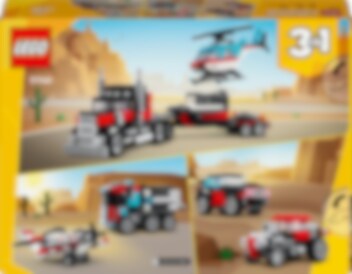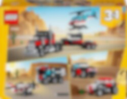 Titta upp i himlen! En helikopter är på väg att landa på ett lastbilsflak. När den har landat kan LEGO® Creator Flakbil med helikopter byggas om till ett kraftfullt propellerplan med en tankbil eller en hotrod med en suv för spännande tävlingar. Du kan även växla upp fantasin och skapa helt egna fordon. Med detta 3-i-1-fordonsset tar all action aldrig slut!