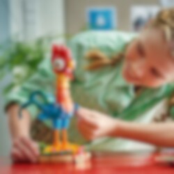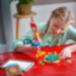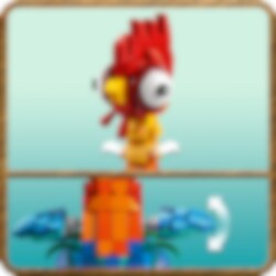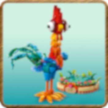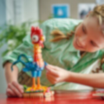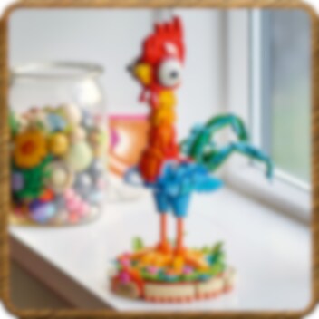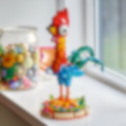 Bygg Heihei från Disneys Vaiana och Vaiana 2! Skapa en filminspirerad modell med Vaianas färgglada tuppvän, som pickar sig genom en rad äventyr men nästan alltid landar med näbben uppåt! När Heihei är klar kan du sätta honom på hans ställ och ändra ställning genom att vrida huvudet och röra vingarna och stjärten upp och ner eller åt sidorna. Släng till honom lite majs – han är en hungrig tupp!
