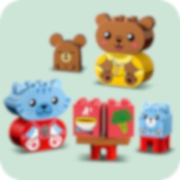 LEGO® DUPLO® Mina första vardagsrutiner: mat och nattning hjälper ditt lilla barn att förstå vikten av vardagsrutiner. Denna färgglada pedagogiska leksak innehåller 2 djurfamiljer – en katt och hennes kattunge och en björn med sin björnunge – som äter en måltid och gör sig redo att sova. Varje djurunge har ett glatt och ett vresigt uttryck för att hjälpa förskolebarn att uttrycka sina känslor kring dessa aktiviteter.