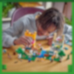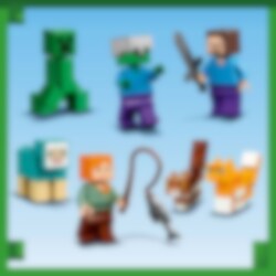 Ta med dina Minecraft® färdigheter till den verkliga världen med denna enorma mix av Minecraft klossar, figurer och tillbehör! Vad ska du bygga först: tornen vid floden, där Steve och Alex skyddar fästningen från en zombie och en Creeper? Kattstugan, där de kan ta hand om katter medan de spränger en Creeper med TNT? Eller kommer du att bygga ett eget fantastiskt Minecraft äventyr?