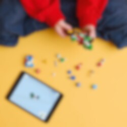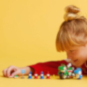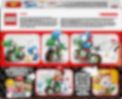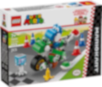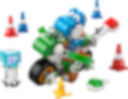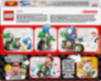 Gör dig redo för Mario Kart action med Light-Blue Yoshi! Cykla på Yoshi Bike och sladda mellan trafikkonerna... eller skjut sköldpaddsskal på dem från cykeln. Men se upp för den hala Banana! Sätt LEGO® Mario, LEGO® Luigi eller LEGO® Peach (figurer ingår inte) i förarsätet för att utlösa Mario Kart ljud och visuella effekter och få olika föremål från Item Box som du kan använda i loppet!
