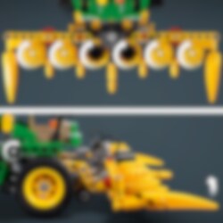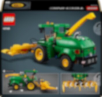 För att få en stor och bra skörd behöver du en mäktig maskin. Och det finns ingen mäktigare än John Deere 9700 Forage Harvester. Nu kan du bygga din egen LEGO® Technic version av denna kraftfulla maskin med ett skördeverktyg längst fram. Höj, sänkoch rotera skördeverktyget för att återskapa originalets rörelser.