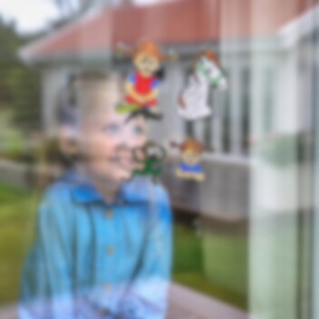 Låt barnens fantasi ta plats i fönstret. Med detta roliga pysselset kan de måla sina egna fönsterdekorationer med Pippi, Lilla Gubben, Herr Nilsson och andra klassiska figurer. Dekorationerna målas på medföljande plastark och kan sedan enkelt fästas på glasytor, helt utan kladd eller lim.