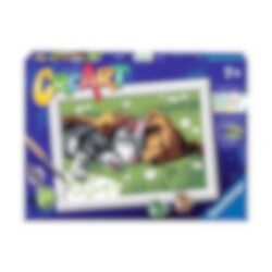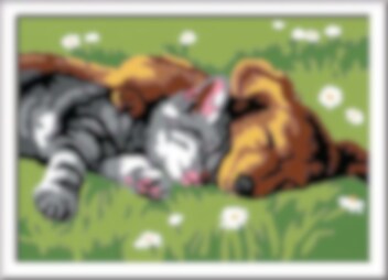 Målarset med motiv av en sovande hund och katt som passar perfekt till den unga blivande konstnären. En kreativ hobby till dem som älskar att måla och följa siffror. Detta set är till dem som är från 7 år. Tavlan är ca 13 x 18 cm stor när den är färdig.