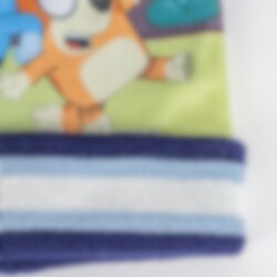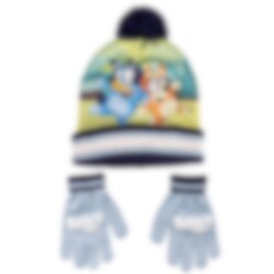 Gör vintern roligare med detta härliga Bluey-set! Den gröna mössan med tofs visar Bluey och Bingo i lek, och de ljusblå vantarna har Bluey-loggan som detalj. Ett fint set för små fans av den populära serien.