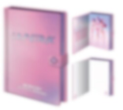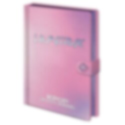 En lyxig anteckningsbok från K-Pop Demon Hunters med ett iriserande, skimrande omslag i rosa och lila toner. Pärmen pryds av "HuntrX"-texten i holografiskt tryck och stängs med en liten tryckknapps-detalj på sidan.