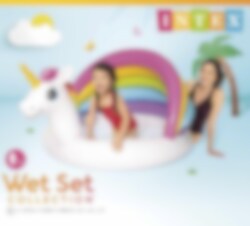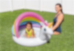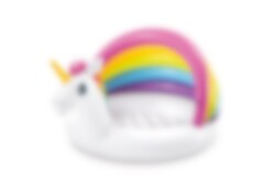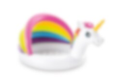 Barnpool från Intex som föreställer en enhörning som blir den ultimata badplatsen för de små barnen under varma sommardagar. Barnpoolen har ett inbyggt solskydd.