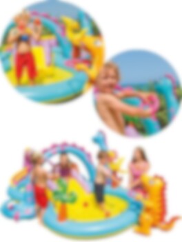 På soliga sommardagar är det härligt för barnen att vara ute och leka och inte minst leka i vatten och plaska runt. Med denna barnpool/vattenpark från Intex så kan barnen både åka rutschkana, leka med ringar eller stå under den svalkande sprayen. Poolen rymmer 280 liter och du ansluter den enkelt till en vattenslang.