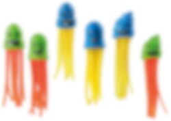 Kasta i bläckfiskarna i poolen och se hur fort du kan fånga dem. Bläckfiskarna gör det ännu roligare när du ska träna på att bli bättre på att simma och dyka. De är väldigt färgglada och är också bra som badleksaker i badkaret för de minsta barnen. Längd 12 cm.