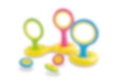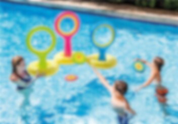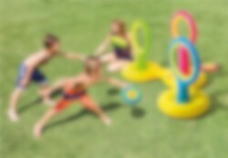 Roligt kastspel för 3 st. spelare som kan spelas både på gräsmattan eller i poolen. Förpackningen inkluderar 3 st. diskar, 3 st. ringar och ett mål med en storlek på 178 x 102 x 104 cm när det är uppblåst.