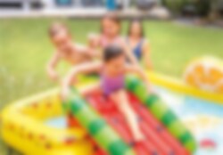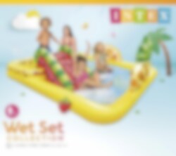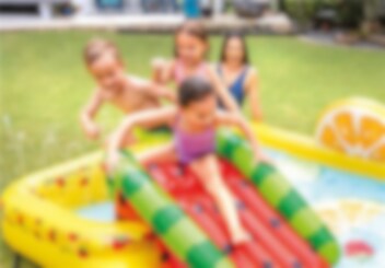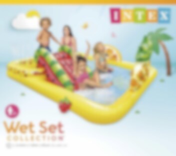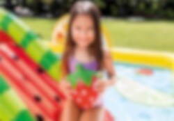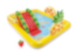Fun'n Fruity Play Center lekbassäng från Intex kommer bli alla barns favorit under sommaren. Det finns både vattenrutschbana och den är full med härliga frukter. Du kan skjuta på mål efter apelsinen med de små bollarna och leka med den uppblåsbara jordgubben. Under vattenmelonsrutschbanan finns det en landningsmatta, så du landar mjukt.