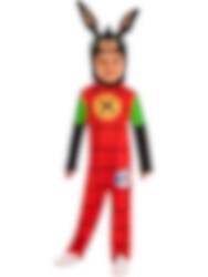 Klä ut det lilla barnet till den älskade kaninen från TV! Denna mjuka och färgglada maskeraddräkt föreställer Bing och är perfekt för kalas, lek eller temadagar på förskolan. Dräkten är tillverkad i mjuk polyester och består av en helkroppsdräkt med fastsydd huva med Bing-ansikte och stora kaninöron.