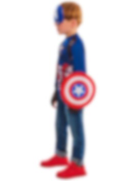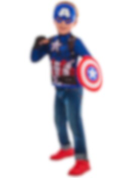 Klä ut dig till den modiga ledaren i Avengers! Det här Captain America-setet innehåller både tröja, mask, handskar och den ikoniska skölden i lätt plast, perfekt för små hjältar som vill rädda världen.
