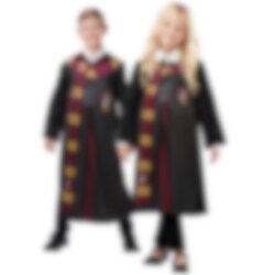Harry Potter Gryffindor Robe inkluderar en svart cape med vackra fotorealistiska tryck och luva. Dräkten finns i två storlekar som passar barn från 3-4 år upp till 5-6 år. Tillverkad av 100 % Polyester. Detta är en officiellt licensierad Harry Potter produkt.