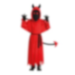 Red Devil Maskeraddräkt inkluderar en kappa med tillhörande huva, horn och svans, ett svart bälte och ett par svarta handskar. Dräkten finns i två storlekar som passar till barn mellan 5 år till 8 år. Dräkten är tillverkad av 100 % polyester och ska endast handtvättas och dropptorkas.